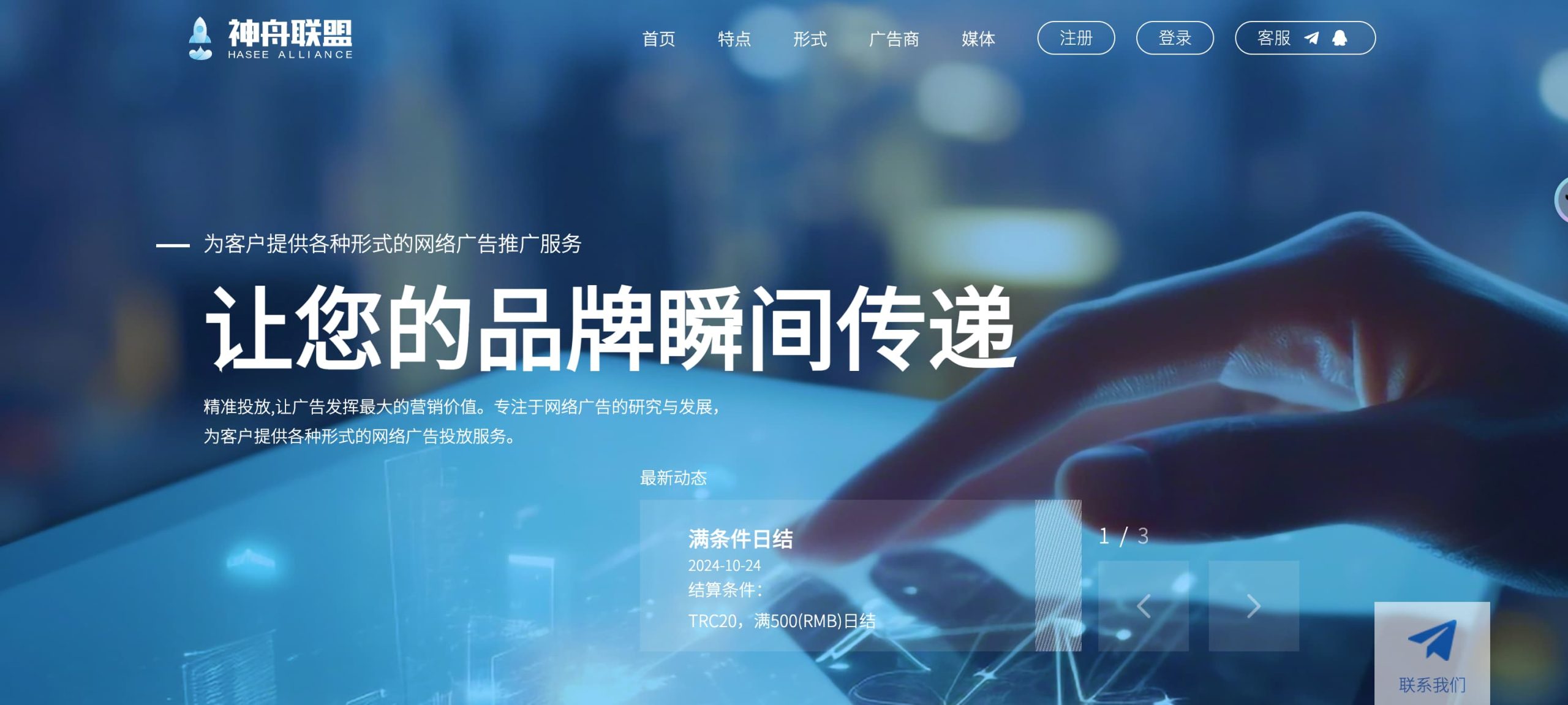 神舟联盟aikelaidev4个月前更新关注谢谢老板0615 精准投放,让广告发挥最大的营销价值。专注于网络广告的研究与发展, 为客户提供各种形式的网络广告投放服务 结算方式 满500,trc20日结算 前往网站 © 版权声明文章版权归作者所有,未经允许请勿转载。THE END国内广告联盟# 国内广告联盟 喜欢就支持一下吧点赞5谢谢老板 分享QQ空间微博QQ好友海报分享复制链接收藏